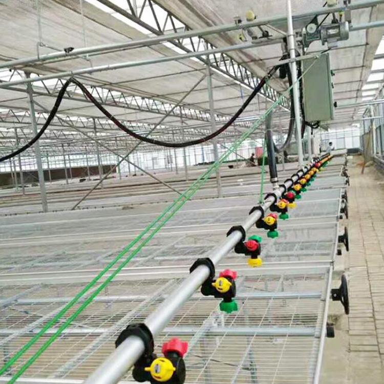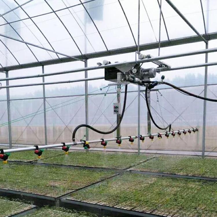 溫室自動(dòng)噴灌機(jī)為普通型雙臂自走式噴灌機(jī),噴灌均勻度高,噴嘴狀況可根據(jù)使用目的進(jìn)行調(diào)整,除常規(guī)灌溉外還可進(jìn)行施肥和試藥等多種作業(yè)工作。